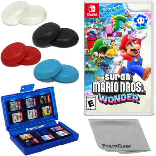 - Included is the following: Super Mario Bros. Wonder for Nintendo Switch Game, 8 pack of PremGear 4 different Colors Thumb Grips (Joystick Cap Covers Compatible with Nintendo Switch/Lite/OLED), PremGear 24 Slot Game card Case/Holder with 2 Slot MicroSD Memory Card Adapter and PremGear Quality Cleaning Cloth