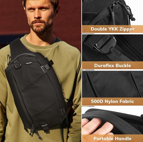 - 【Heavy-Duty & Water-Resistant Construction】Engineered with rugged 500D ripstop nylon, this tactical sling bag delivers tear-resistant and water-repellent performance. The main compartment fits a 13.3" laptop or tablet and features internal lid pockets with dual mesh organizers. Ideal as a durable tactical backpack or sling bag for men and women.