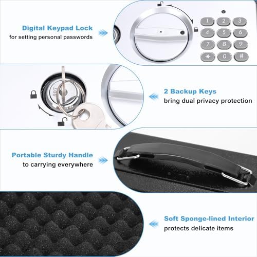 - ROBUST SECURITY: Made of heavy-duty steel, the Security box with code provides rock-solid security for your personal items, whether in your bedroom drawer or checked luggage. The portable carrying handle makes it perfect for home and business trips. Note: The metal casing offers essential protection, its thickness is limited and may be compromised under extreme force, such as with pry tools or blunt impact.