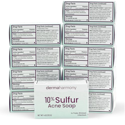 SIZE: 4 oz. - 10 Bars - Individually PackagedDermaHarmony 10% Sulfur Soap is ideal for Acne, Seborrheic Dermatitis, Clogged Pores, Pimples, Eczema, Zits, Blackheads, Rosacea, Tinea Versicolor, Fungus, Bacteria, Dermatitis, Vulgaris, Oily Skin, Whiteheads, and Blemishes. It is especially good at reducing the servity of and clearing-up acne blemishes, pimples, blackheads, whiteheads and clogged pores. DermaHarmony Sulfur Soap is safe for daily use by adults and children.