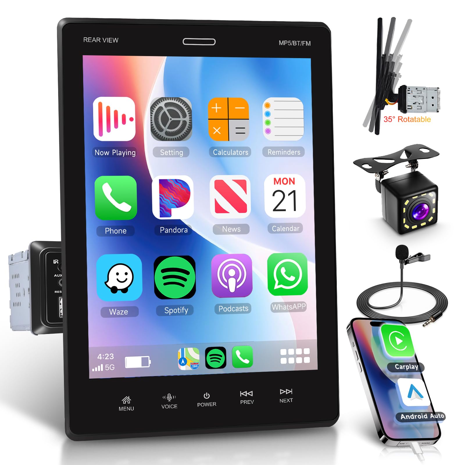 9.5inch Single Din Touchscrren Car Stereo with Carplay Android Auto,1080P IPS Detachable Touch Screen,5.0Bluetooth,12LED IP69k Backup Camera,FM Radio GPS,USB/AUX,Mirror Link,SWC