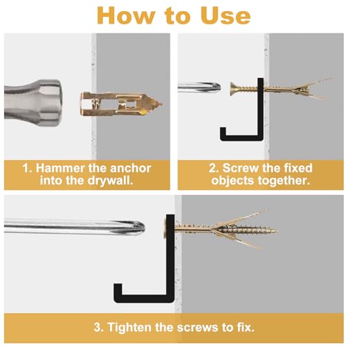 - Method Of Use: ①Knock the no drill anchors into the wall. ②Insert the screws into the Anchors. ③Tighten screws until secure