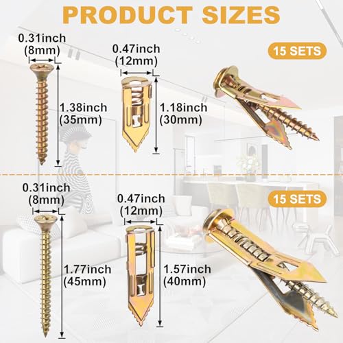 - Package Included: 30 Pcs anchors (0.47"x1.18"/12mm×30mm, 0.47"x1.57"/12mm×40mm) and 30 pcs screws (0.31''×1.18''/8mm×30mm, 0.31''×1.77''/8mm×45mm)
