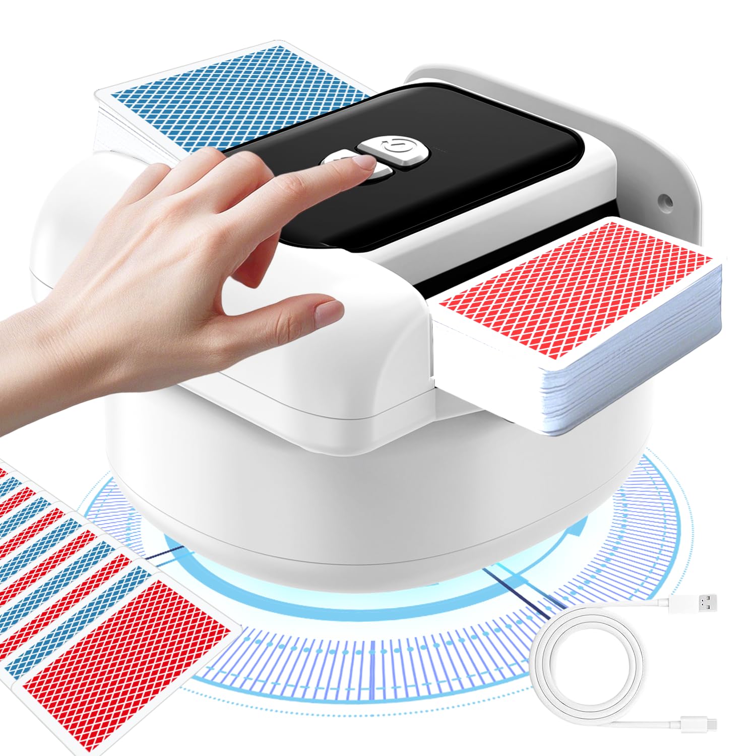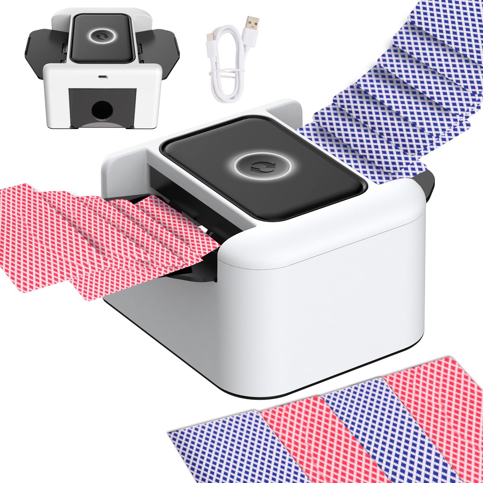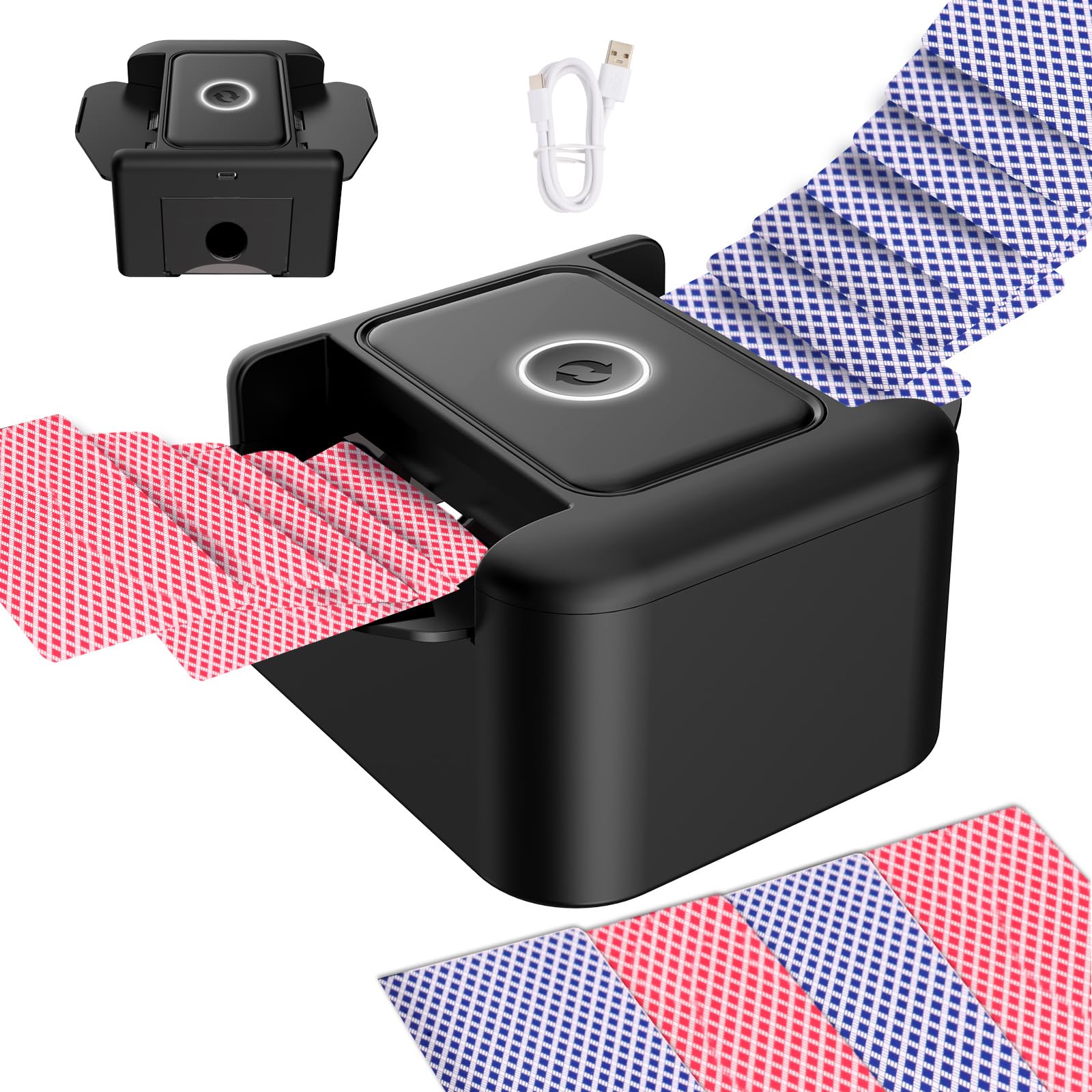 - 【USB-C Rechargeable Automatic Card Shuffler for 2 Decks】Automatic Card shuffler Rechargeable upgraded one-button auto shuffler of 1-2 decks of playing cards. The built-in 2000mAh battery, charging via USB. And shuffle about 2300 times on a full charge. Please fully charge before use. The option to use battery power is great for when you're playing games outdoors or where a power outlet isn't readily available.
