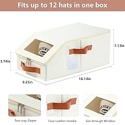 Stackable Hat Organizer for Baseball Caps: Reinforced bottom board layers keep baseball caps neatly stored. No more crushed brims with this hat storage! Easy-Access Zipper Lid for Quick Retrieval: The hat organizer comes with a smooth zipper closure, allowing you to open and close it effortlessly. With clear window, no more digging through piles—just unzip, grab your favorite baseball hat, and go! Large Capacity (16.1”L x 9.3”W x 7.1”H) : It holds up to 12 baseball per hat box (24 caps for 2-pack, 48 caps for 4-pack). Designed for hat storage for baseball caps, this organizer maximizes space while fitting neatly in closets, shelves, or car trunks Portable with Dual Handles for Easy Carrying: Features two side handles for convenient transport. Move your baseball cap organizer from room to room or take it on trips—effortless storage for baseball hat collections Multi-Purpose Storage & Label Slot for Organization: Beyond baseball hat organizer, this cap organizer also stores clothes, books, and scarves. The name card helps categorize items, perfect for men’s hat boxes and home organization