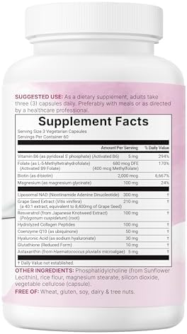 - Each bottle contains 180 vegetarian capsules, featuring Liposomal NAD plus Grape Seed Extract, Resveratrol, Hydrolyzed Collagen Peptides, CoQ10, Hyaluronic Acid, Glutathione, Astaxanthin, activated Vitamin B6 (P5P), Methylfolate, Biotin, and Magnesium Glycinate.