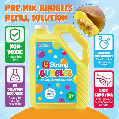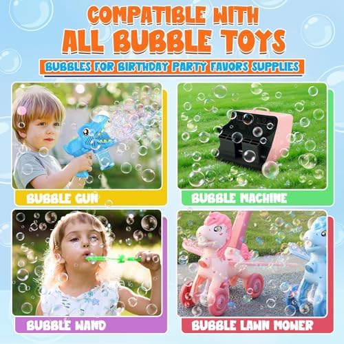 - NON-TOXIC & SAFE BUBBLE SOLUTION: Prioritizing safety, our non-concentrated solution passes rigorous tests, it’s 100% child-safe, no irritation for people's skin with touch. The biodegradable formula leaves no residue, making cleanup easy after backyard playdates or pool parties. Each blow can generate dozens of bubbles. Perfect outdoor use for kids bubble toys. Do Not Drink.