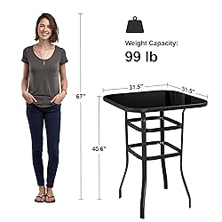 Practical Table: This tempered glass outdoor table is suitable for most decoration styles or outdoor places, looking exquisite and classic, near and far. Matching a set of fancy chairs, they will be a highlight in your garden, yard, or balcony Sturdy Metal Frame: This outdoor bar-height table features a tempered glass tabletop and is built with a strong metal frame for stability and durability. It resists deformation and maintains its shape, ensuring long-lasting use in outdoor settings Indoor/ Outdoor Table: Featuring a simple, classic appearance and neutral color, this table can be used both indoors and outdoors. You can match it with a set of dining chairs, barstools, or accent chairs as you like Better Stability: This patio table is designed with two support rings for added stability, offering double the security compared to a single support. It's ideal for holding drinks, magazines, or other small items as you enjoy your tea time Strong Structure: This iron-framed outdoor dining table is designed for high strength and can support a significant weight capacity. With a maximum load of 99 lb, it offers reliable stability for all your dining needs