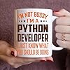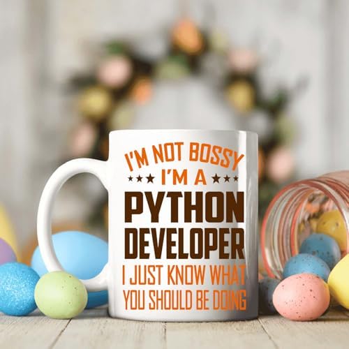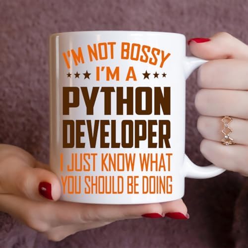 - [Perfect Gift For Python Developer Professionals]: Honor a Python Developer’s expertise with this 11oz white ceramic mug featuring the humorous quote - I’m Not Bossy, I’m a Python Developer – I Just Know What You Should Be Doing. Ideal for work or gifting.