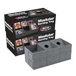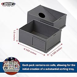 - Organize your trading cards and collectibles with precision using the BCW Modular Sorting Tray. This innovative solution allows you to tailor your sorting experience to fit your exact requirements. The tray consists of individual card cells that seamlessly slide together using special dovetail joints, ensuring a sturdy and secure fit. Whether you're sorting, displaying, or storing, the BCW Modular Sorting Tray offers unmatched versatility. Each cell can be adjusted to your preference, whether you prefer cards to be displayed at an angle for easy viewing or laid flat for efficient sorting. With interior dimensions of 3 1/8 x 4 1/8 x 1 1/2 inches, these cells are spacious enough to accommodate cards in sleeves, toploaders, or magnetic holders. The stackable design allows for efficient storage when not in use, making it ideal for collectors with limited space. Perfect for sports cards, Magic the Gathering, Pokémon, and a variety of other games, the BCW Modular Sorting Tray is a must-have accessory for any serious collector or hobbyist. Each pack includes six cells, providing ample opportunity to customize your tray to suit your collection. Streamline your sorting process and elevate your display with this versatile and practical solution from BCW.