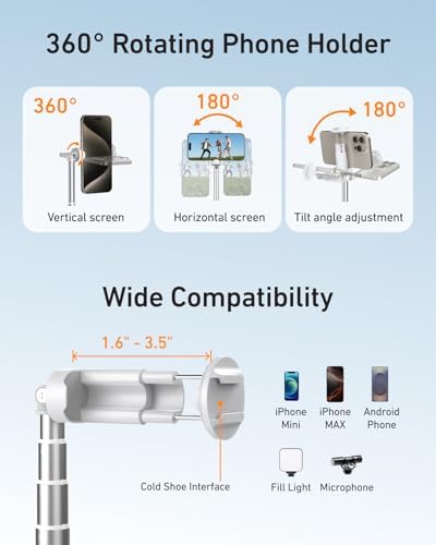 - Built-in Cold Shoe Mount: Features an integrated cold shoe mount directly on top of the phone holder, allowing you to easily attach essential accessories like an external microphone (mic) or video light for enhanced audio and professional lighting while filming hands-free or capturing selfies. Upgrade your vlogging gear seamlessly.