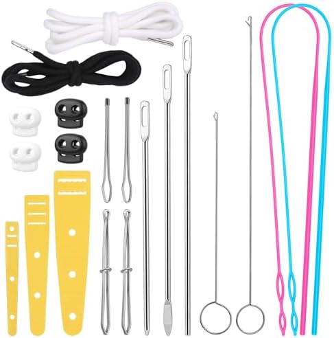 - Complete Product Types: Our drawstring threader tool set includes 20 pieces sewing products, include 3 metal drawstring threaders, 2 loop turner hooks long and short, 4 different metal tweezers, 2 flexible plastic drawstring threader tools, 3 flat plastic elastic threaders in S/M/L sizes, also with black and white drawstring cords in 51in/1.3m length and 4 cord locks.