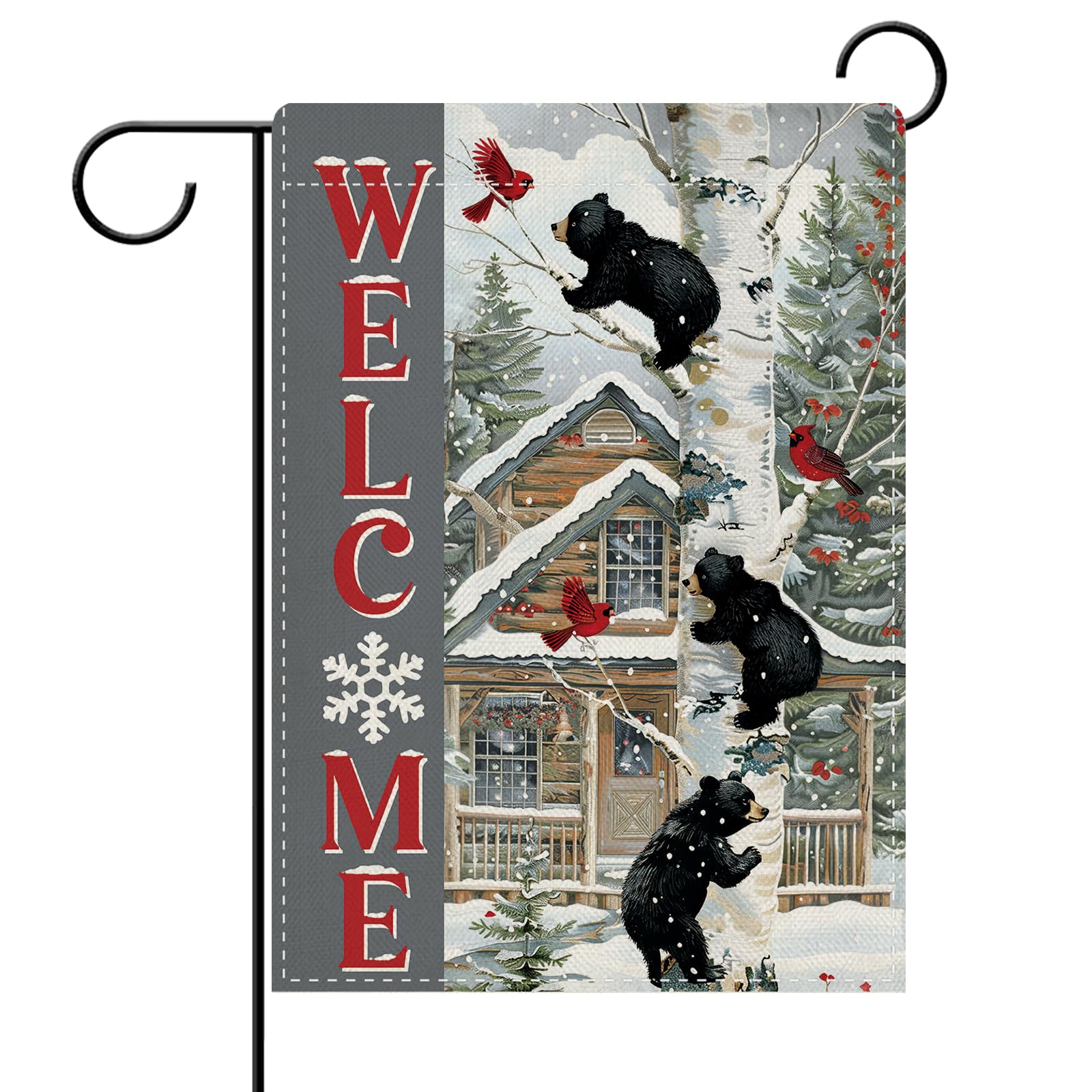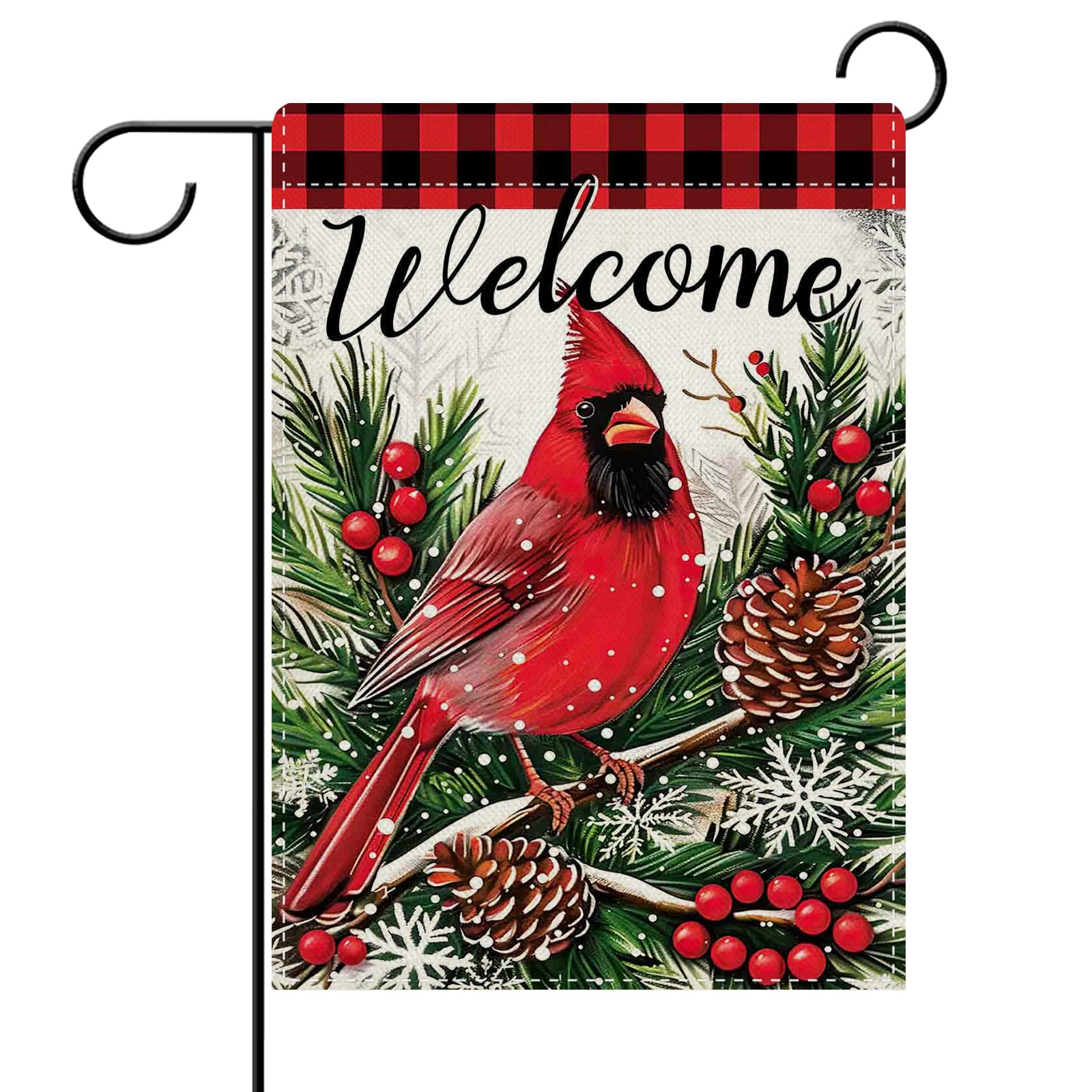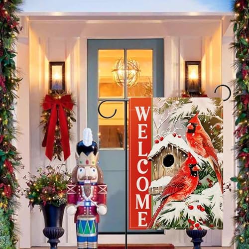 Dyrenson Welcome Christmas Cardinal Decorative Garden Flag, Xmas Tree Red Birds Birdhouse Berries Yard Outside Home Decoration, Snowy Winter Holiday Burlap Outdoor Small Decor Double Sided 12 x 18