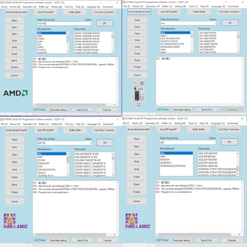 - Programmer Characteristic:Supporting Windows XP,Windows Vista,Windows 7,windows 8 and windows 10 ;With low-power consumption,can be used as VGA signal generator,easy to repair ;Support 24/25/93/95 series serial SPI Flash. EEPROM offline read and write.Support 26/27/28/29/30/39/49/50 series NOR Flash/ PROM read and write;Support TSOP48 and BGA footprint NAND Flash parameter automatic identification and offline reading;Support the mainstream device,including E/EPROM、MCU、EC、SPI NOR flash、parallel NOR flash、SPI NAND,etc;