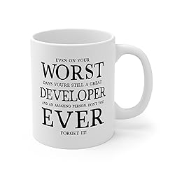 - Let your Developer start their day with their coffee/tea or any favorite drink in this novelty mug. This high quality 11oz. ceramic white mug has a premium hard coat that provides crisp and vibrant color reproduction sure to last for years. Perfect for all hot & cold beverages. High Gloss + Premium White Finish. Dishwasher and Microwave Safe 3.7″H x 3.7″W x 3.2″D 10.2″ Circumference.