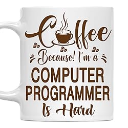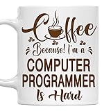 [Humorous Gift for Computer Programmer Professionals]: This 11oz white ceramic mug features the funny quote: Coffee, Because! I'm a Computer Programmer Is Hard, perfect for Computer Programmer who rely on coffee to power through their challenging days. [Durable Ceramic Design]: Crafted from premium white ceramic, this 11oz mug is microwave-safe and dishwasher-safe, perfect for daily coffee or tea in any workplace. [Comfortable Size For Workdays]: With an 11oz capacity, this mug fits seamlessly in an office or home setting, designed with a sturdy handle for Computer Programmer enthusiasts. [Perfect Gift for Any Occasion]: Surprise your favorite Computer Programmer with this personalized mug on birthdays, holidays, or as a thoughtful appreciation gift. It’s a great way to celebrate their hard work and dedication! [Ideal Size for Coffee Lovers]: With an 11oz capacity, this mug is the perfect size for coffee, tea, or any beverage, making it for any Computer Programmer needing a caffeine boost during their busy schedule.