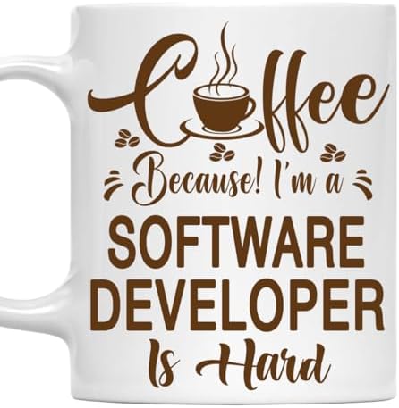 - [Humorous Gift for Software Developer Professionals]: This 11oz white ceramic mug features the funny quote: Coffee, Because! I'm a Software Developer Is Hard, perfect for Software Developer who rely on coffee to power through their challenging days.