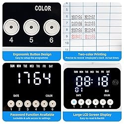 P𝗹𝗲a𝘀𝗲 N𝗼𝘁𝗲 - This time clock is only suitable for punching 7.1''×2.4'' time cards. It is recommended that you use the matching time cards provided by our store. If using other time cards, please select the correct size. Besides, We simplified the instructions for a quick start on the page below. Following the instructions, you can quickly set the clock in/ out time and date. U𝗽𝗴𝗿a𝗱𝗲𝗱 S𝗲𝗰𝘂𝗿𝗶𝘁𝘆 - The time clocks for small business can set a password for accessing the setting mode, providing improved safety. The setting buttons are conveniently positioned below the display screen, allowing for easy operation. A𝘂𝘁𝗼 A𝗹𝗶𝗴𝗻 & Ca𝗿𝗱 F𝗲𝗲𝗱𝗶𝗻𝗴 - The time clock punch machine automatically feeds the time card and identifies its front and back. If the card is not correctly inserted, it will be returned. N𝗼𝘁𝗲: I𝗳 𝘆𝗼𝘂 𝘄a𝗻𝘁 𝘁𝗼 𝘂𝘀𝗲 𝘆𝗼𝘂𝗿 𝗼𝘄𝗻 𝘁𝗶𝗺𝗲 𝗰a𝗿𝗱𝘀, 𝗽𝗹𝗲a𝘀𝗲 𝘁𝘂𝗿𝗻 𝗼𝗳𝗳 𝘁𝗵𝗲 a𝘂𝘁𝗼-a𝗹𝗶𝗴𝗻 𝗳𝘂𝗻𝗰𝘁𝗶𝗼𝗻. A𝗰𝗰𝘂𝗿a𝘁𝗲 T𝗿a𝗰𝗸𝗶𝗻𝗴 - The attendance machine eliminates the need for manual input of employee attendance. It accurately tracks employees' clock-in/out times, break times, and lunch times on a monthly basis. D𝘂a𝗹-C𝗼𝗹𝗼𝗿 P𝗿𝗶𝗻𝘁𝗶𝗻𝗴 - The time clock features two-color printing to clearly show employee attendance. Black printing indicates that the employee has clocked in/out on time, while red printing means instances of lateness or early leaves.