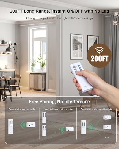 - 200 FT Longer Remote Range - Strong RF signal of this remote light switch can work through walls, doors, and windows, giving you the freedom to place the switch wherever it's most convenient for you. lag-free response when turning devices on/off from across the room.