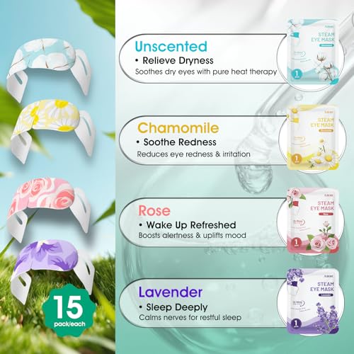 - 【60-Pack Steam Eye Masks for Dry Eyes】Self-Heating Eye Mask Therapy with 4 Soothing Scents - 15 Each of Lavender (Stress Relief), Chamomile (Calming), Rose (Mood-Boosting) & Fragrance-Free (Hypoallergenic). Perfect for Daily Use, Travel & Gifting.