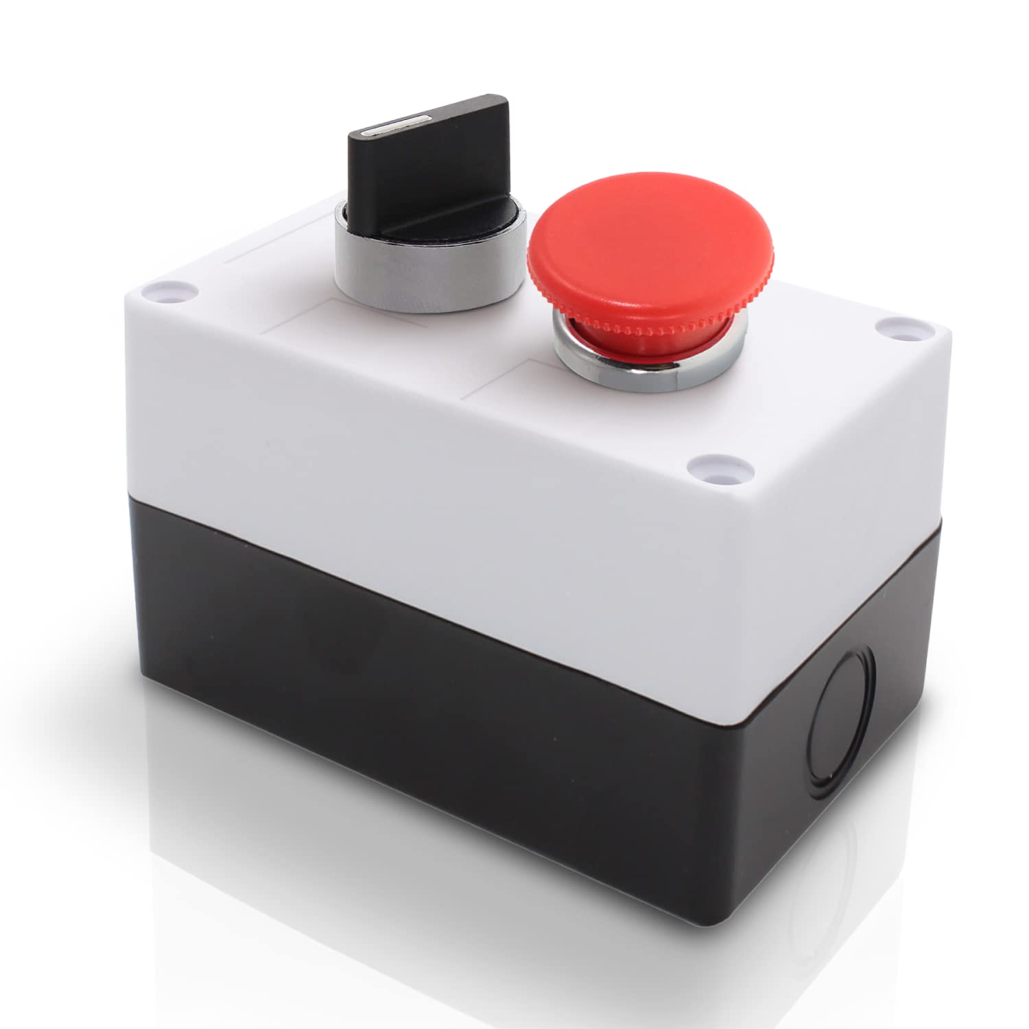 2 Position Maintained Selector Rotary Key Switch - Self-Lock Switch, 22mm Mounting Hole Size, 1NO Control Function, 415V and 10A + Single Push Button Switch Control Enclosure Box 22mm
