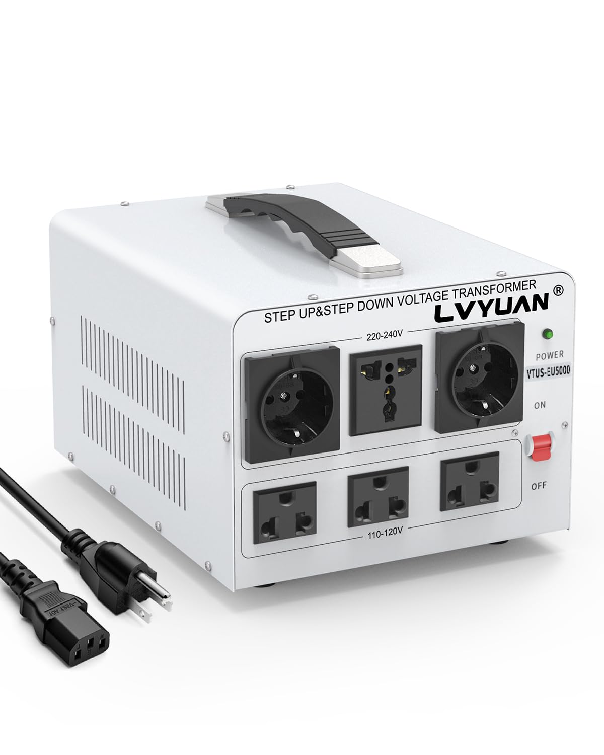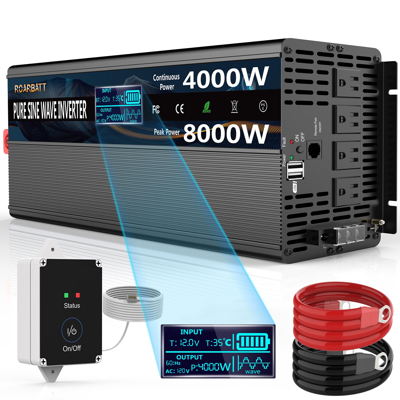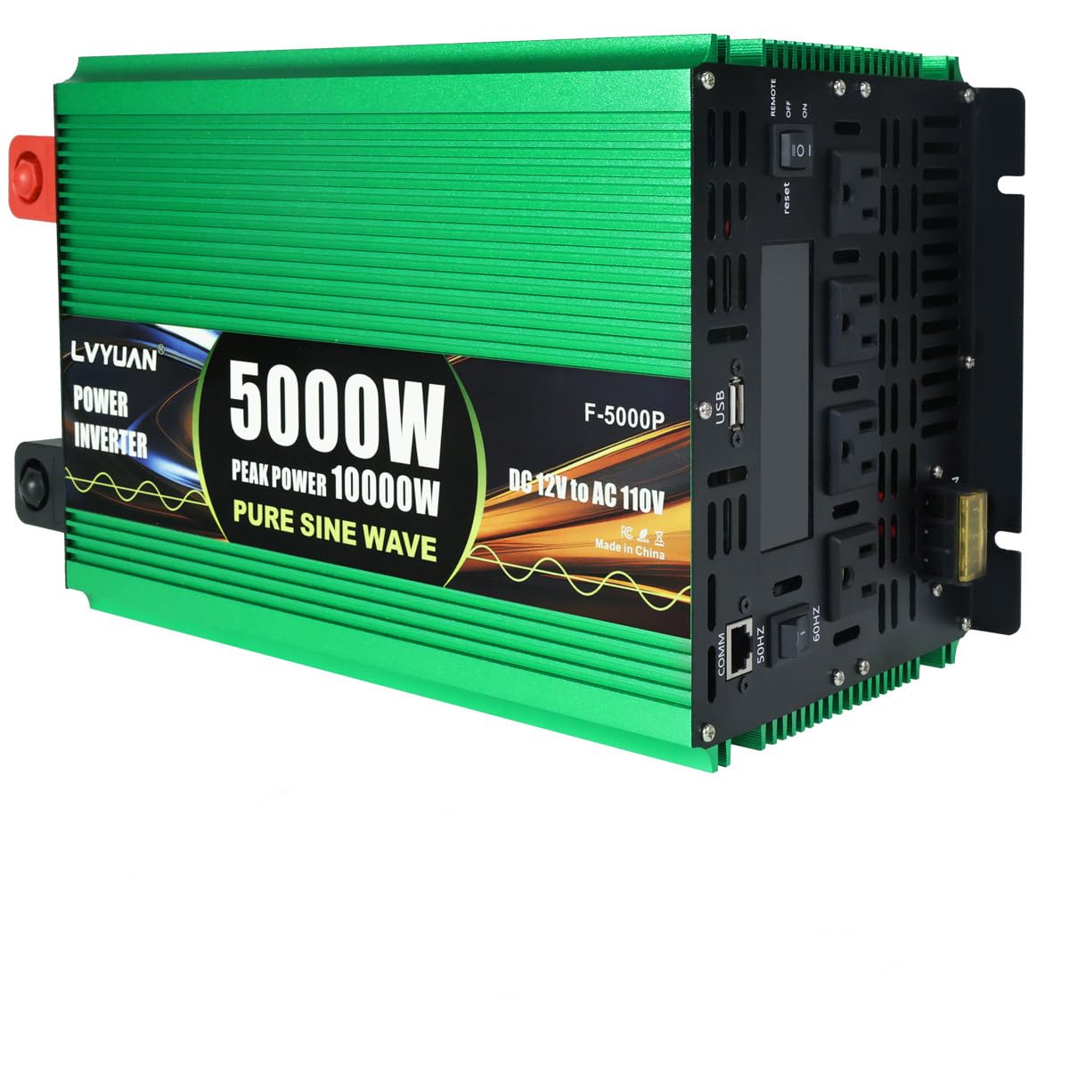 - [Your Budget Pure Sine Wave Inverter] LVYUAN power inverter efficiently converts 12V DC to 120V AC, delivering 5000W continuous power and 10000W surge power for high-demand applications. Utilizing high-efficiency conversion and low-interference technology, it combines low energy consumption with minimal no-load loss. Equipped with 4 US-standard 120V AC outlets and 4 USB ports, this inverter ensures you’ll never run short of power. Whether for outdoor adventures or indoor use, it serves as a reliable backup power source.
