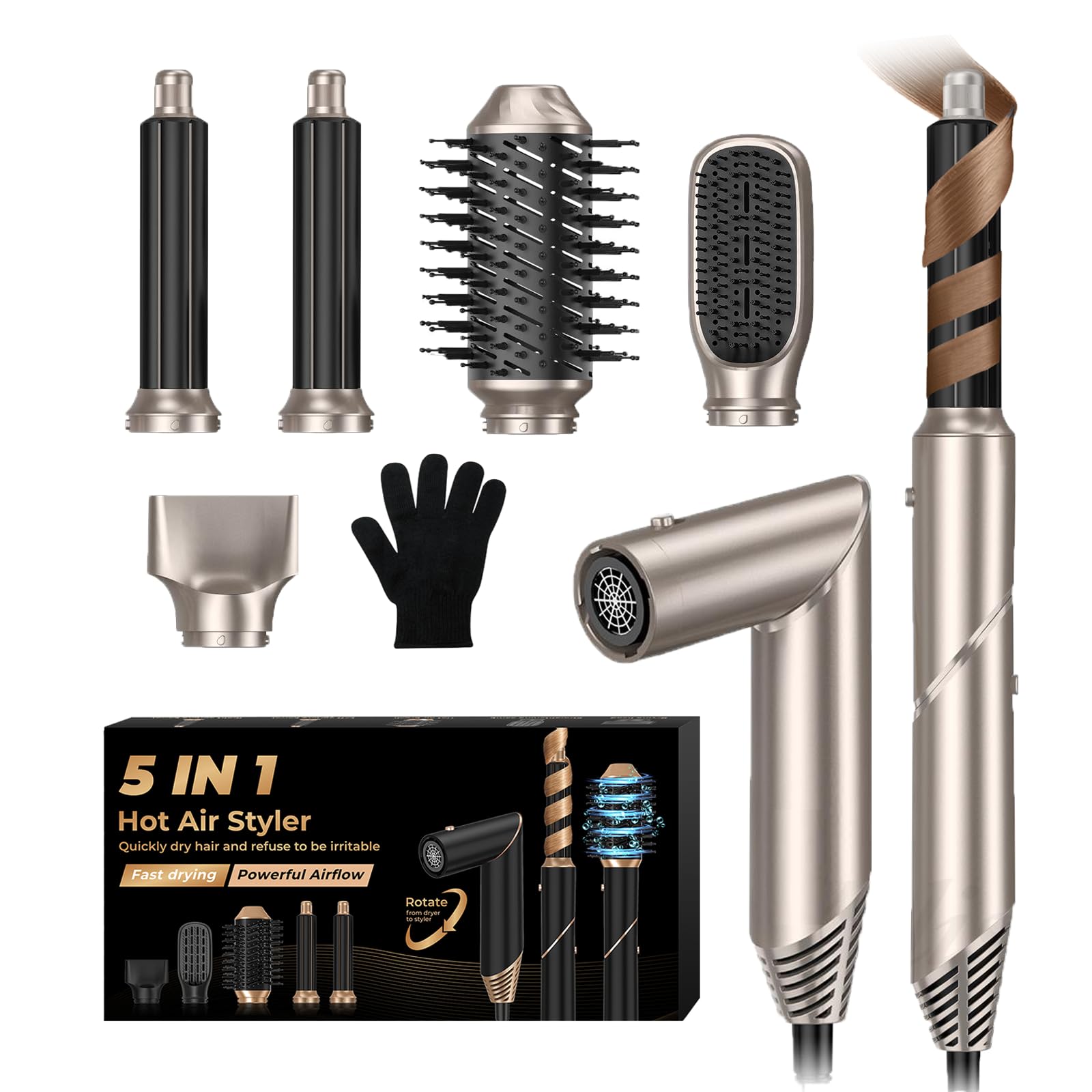 - 【5 IN 1 STYLING SET】 --- Our versatile styling set includes a blow dryer brush, hair straightener, left&right 1 1/4 Inch rotating curling iron, round brush for blow drying & volumizing, hairdryer, and an exquisite storage box. Hair brush blow dryer plug has a standard US ALCI Safety Plug Auto Leakage Protection. This hair set is perfect for achieving salon-quality hairstyles at home.