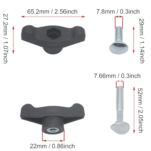 You will receive 2 pcs of T handle knob nut screw bolts for lawn mower. Lawn mower handle bolt is made of plastic and metal, strong and sturdy, rust resistant, not easy to break, long service life. Special T design, feel good, labor saving, light weight, convenient and durable, easy to carry and use. T handle knob nut screw thread deep and complete, neat and clear, uniform force, not easy to slide. And lawn mower handle bolt fits for fastening purpose of many models of lawn mower handle or other machines. Please check the diameter of the screw holes of the existing equipment carefully before purchase to prevent the inability to install.Specification:Product name: Lawn mower handle knobs nut bolt.Size: Length of lawn mower nut: 6.52 cm / 2.56 inch. Diameter of long bolt diameter is 7.66 mm / 0.3 inch, diameter of short bolt 7.8 mm / 0.3 inch.Material: Plastic and iron.Color: Black.You will receive: 2 pcs T handle knob nut .2 pcs short bolts. 2 pcs large bolts.Notes:1.Manual measurement, please allow slight errors on size.2.The color may exist slight difference due to different screen displays.