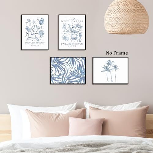 JUIOEIU Coastal Beach Christian Wall Art Prints Set of 4, Blue Preppy Beach Seashell Palm Tree Ocean Animals Bible Verse Wall Art Posters for Home Bedroom Living Room Decor, 12x16 Unframed