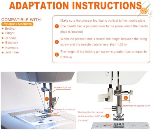 - Fits most 7mm low shank sewing machines and quilting machines(The presser foot bar is perpendicular to the needle plate at 90°, the height of the presser foot when raised is less than 1.02 in, and the length of the locking screw is greater than or equal to 0.394 in), including Brother, Singer, Janome, Babylock, Kenmore, and more, not suitable for high shank sewing machines and slant shank sewing machines, The feed dog width of the open toe presser foot is 0.669 in. Please confirm the width of your sewing machine feed dog and the compatibility of the machine before purchasing