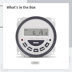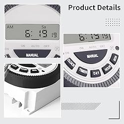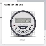 Advanced timing control: program up to 17 on/off events daily; precise minute-by-minute control; flexible modes with manual override; converts everyday devices to automated ones Reliable relay design: dual relay output; handles 16a current; built-in battery backup keeps timing accurate and consistent Simple-to-operate interface: lcd display shows time and operating status; user-friendly button setup; large screen improves visibility Versatile applications: for controlling pool pumps, lights, fans, and industrial devices; fits various scheduling needs Long-lasting durability: impact-resistant shell protects components; secure mounting design ensures stable setup; delivers dependable automation