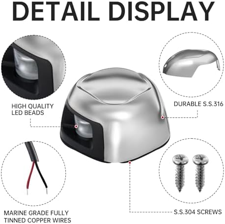 - 【Marine-Grade Durability】:Ensure safe pontoon navigation lights with ultra-bright LED lights featuring standard 112.5° horizontal beam angle and 1 nautical mile visibility for collision prevention, while delivering energy-efficient, long-lasting performance