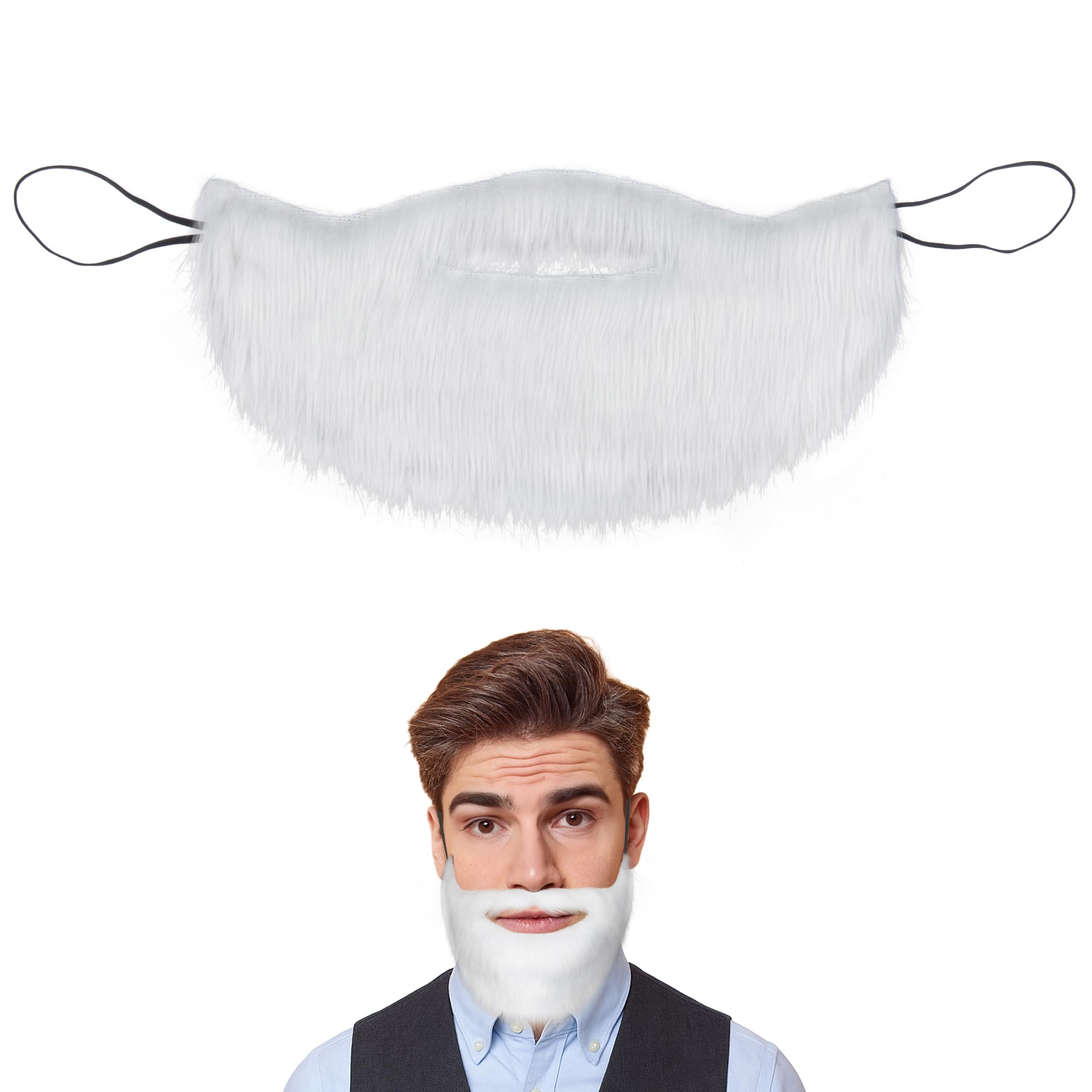 Add instant personality to your costume with this white and gray fake beard set. Featuring thick, fluffy synthetic fibers and a stylized mustache, this beard offers a dramatic transformation ideal for cosplay, role play, or holiday fun