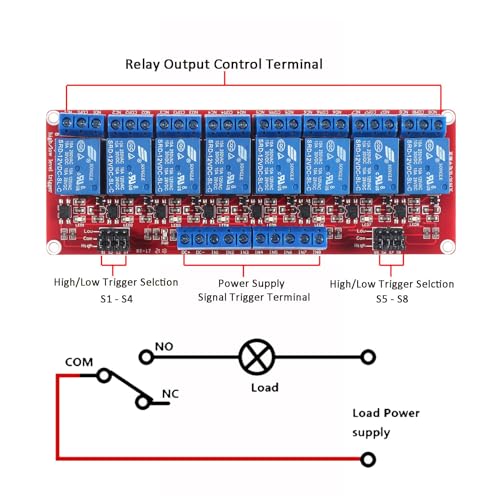 - Plug-and-Play Wiring: Screw terminals for 12V power (DC+/DC-) and IN1-IN8 control signals; NO/COM/NC outputs pre-labeled.