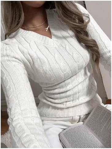 Verdusa Women's Fall Cable Knit Sweater V Neck Long Sleeve Slim Fitted Casual Pullover Tops