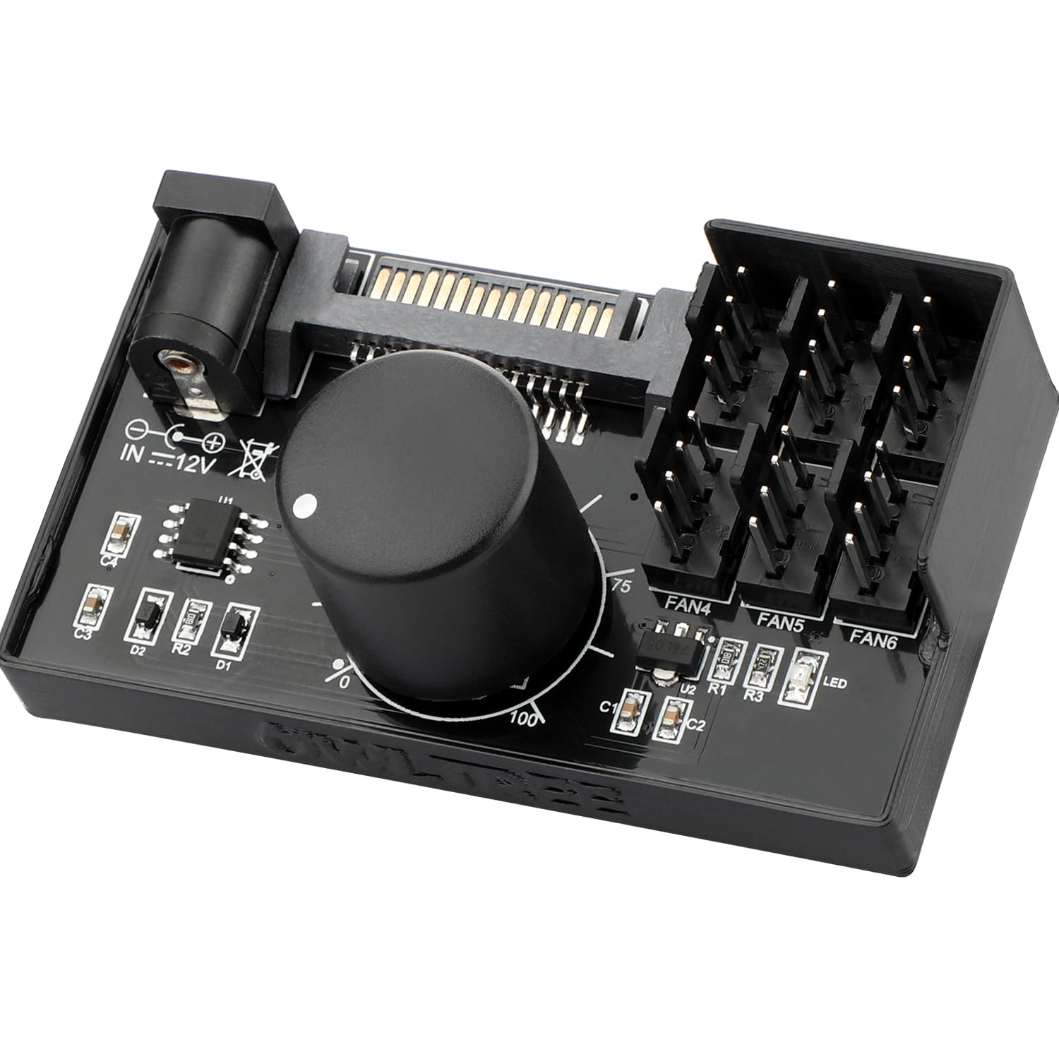 4 Pin 12V PWM Fan Controller 6 Fans Supported , PC Fan Adapter Hub Powered by SATA and DC 5525, Cooling Fan Speed Knob with Max Total 60W 5A Output