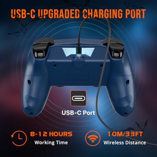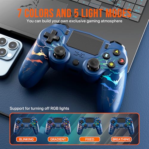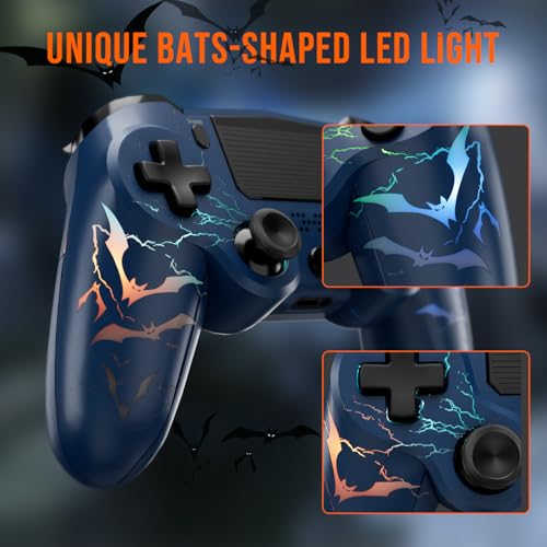- 7-Color Lighting and 5 LED Modes: Enhance your gaming experience with our wireless controller for PS4 featuring a unique bat-shaped pattern. Create a vibrant atmosphere with 7 colors and 5 lighting modes: solid, breathing, gradient, RGB strobe, and off, making your gameplay even more immersive!