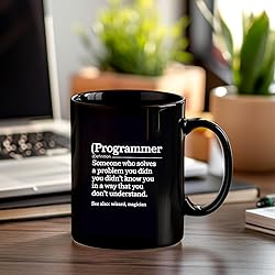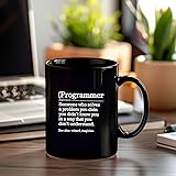 Definition Programmer Meaning - Computer Science & Coding Mugs are Double-Sided Printed: Our designs are printed on both sides using advanced, high-quality technology to ensure exceptional durability and resistance to peeling or fading. Ceramic Mug: This high-quality ceramic mug is designed for easy maintenance, with gentle handwashing recommended to preserve its durability. Perfect for both hot and cold drinks, it’s an excellent addition to any drinkware collection. Great for Gifting: Whether for yourself or a loved one, this mug makes an ideal gift for coffee enthusiasts. It adds a delightful touch to any home or office, making it perfect for occasions like holidays, Christmas, birthdays, or Valentine's Day. It’s an excellent present for friends, colleagues, bosses, or family members. Available in Two Convenient Sizes: Choose from 11 oz and 15 oz options, both featuring a sleek glossy black finish that enhances the elegance of any kitchen or office setting. These mugs are designed for convenience and efficiency, perfect for enjoying your morning coffee or a midday refreshment. Our Quality Promise: Shop with confidence by placing your order today. If you have any questions, concerns, or suggestions about product quality, customer service, or our operations, feel free to reach out. We value your feedback and appreciate your support. Thank you!
