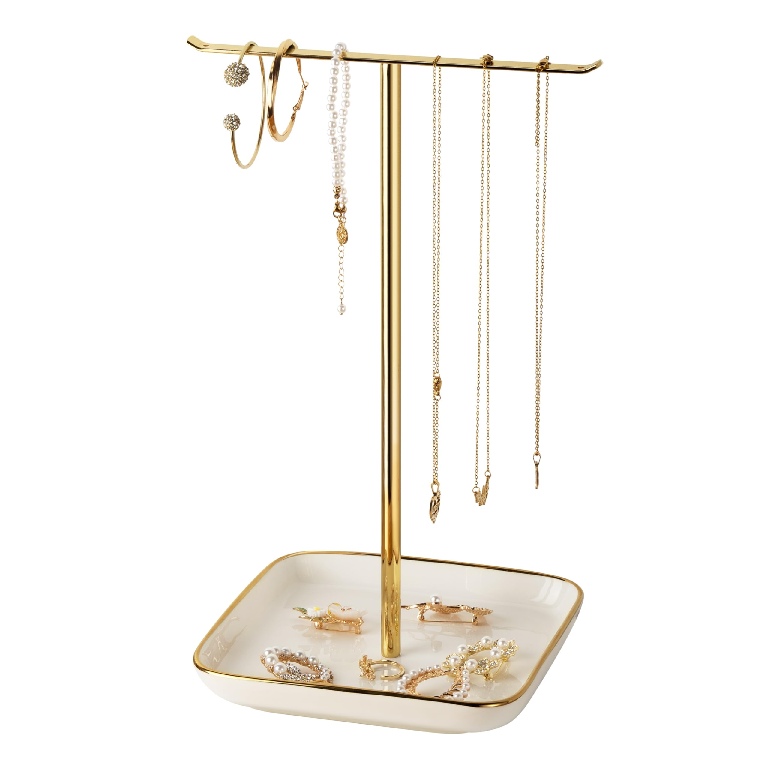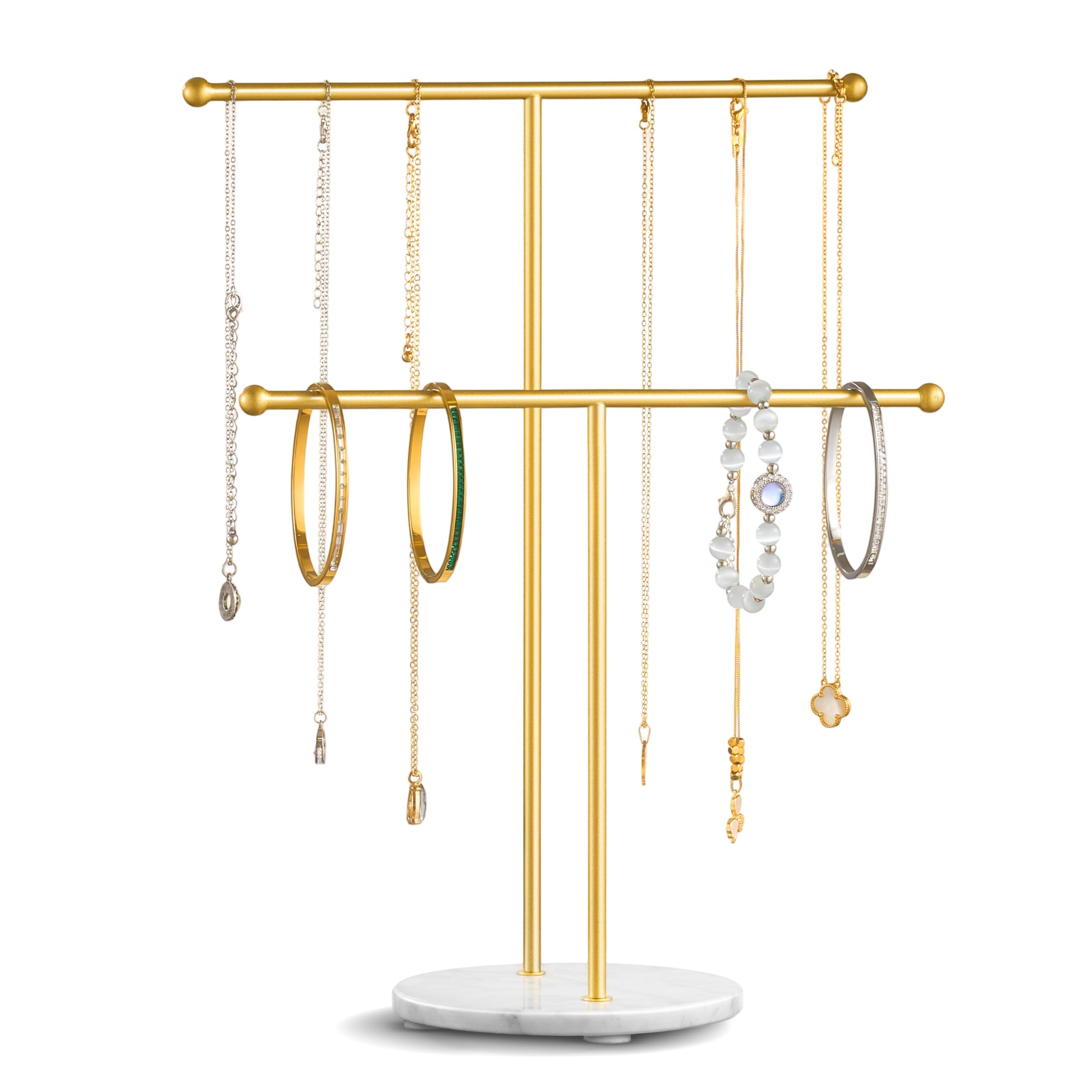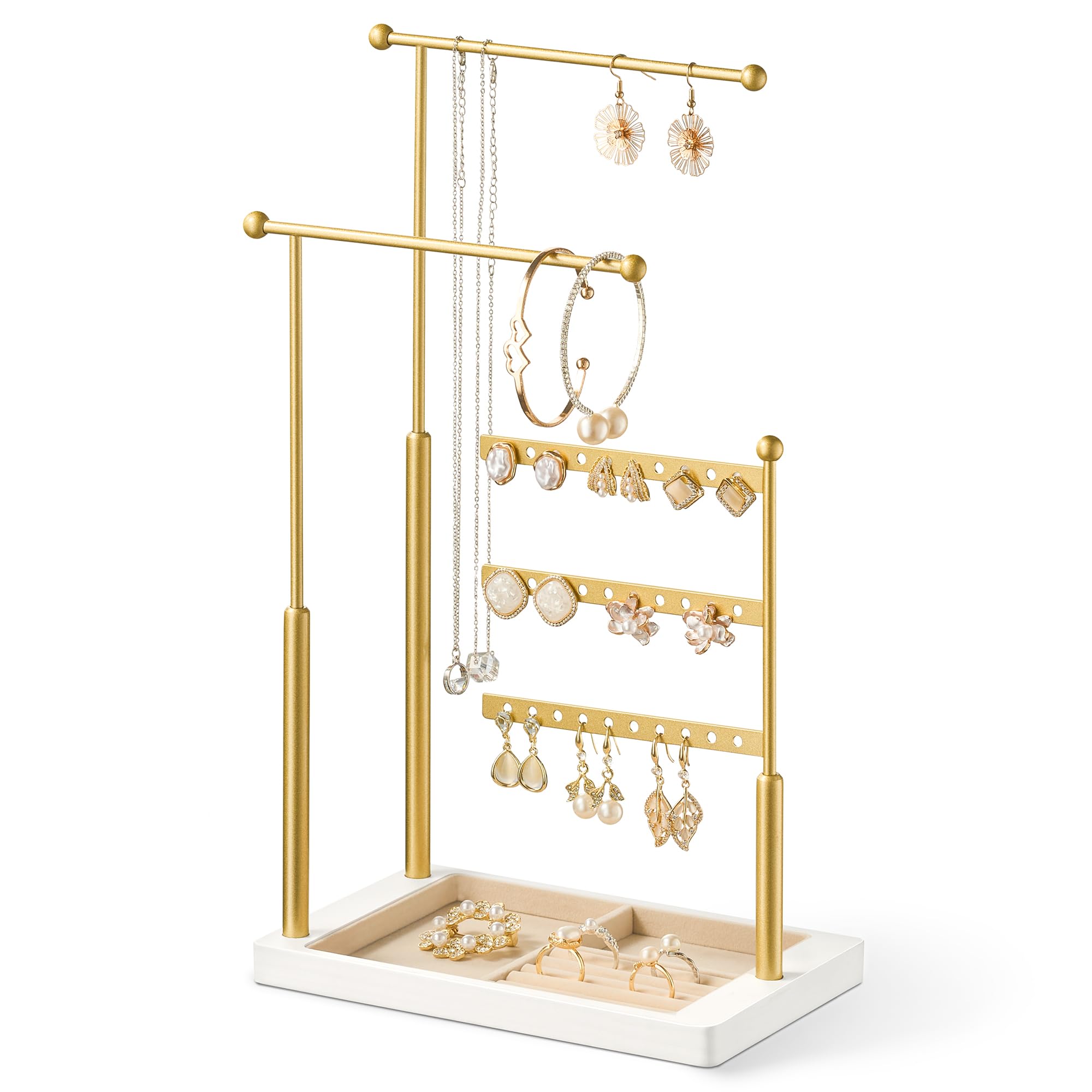 pickpiff Jewelry Holder Organizer with Velvet, Adjustable 10"-17" Tall, Metal Stand for Display Bracelet, Necklace, Earrings, Rings, White and Gold