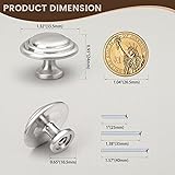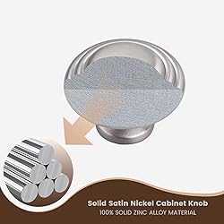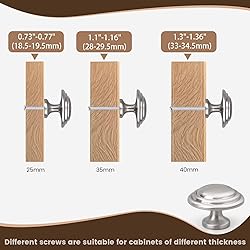【Measurement】Diameter: 1.32 Inch(33.5mm); Height 0.95 Inch(24mm); Base Diameter: 0.65 Inch(16.5mm) 【Solid Zinc Alloy】Brushed Nickel cabinet knobs are made of solid zinc alloy, sturdy and durable. 【Package Includes】Each Satin Nickel drawer knob comes with 3 screws: 1 Inch(25mm), 1.38 Inch(35mm), 1.57 Inch(40mm). You can choose the right screws according to the thickness of the cabinet. 【Widely Application】The modern Brushed Nickel cabinet knobs enhance the taste of your kitchen, bedroom and bathroom, suitable for all kinds of dressers, drawers, closets and cabinets, etc 【Easy to Install】 Our sliver dresser knobs can be installed quickly and smoothly in a few minutes with a screwdriver.
