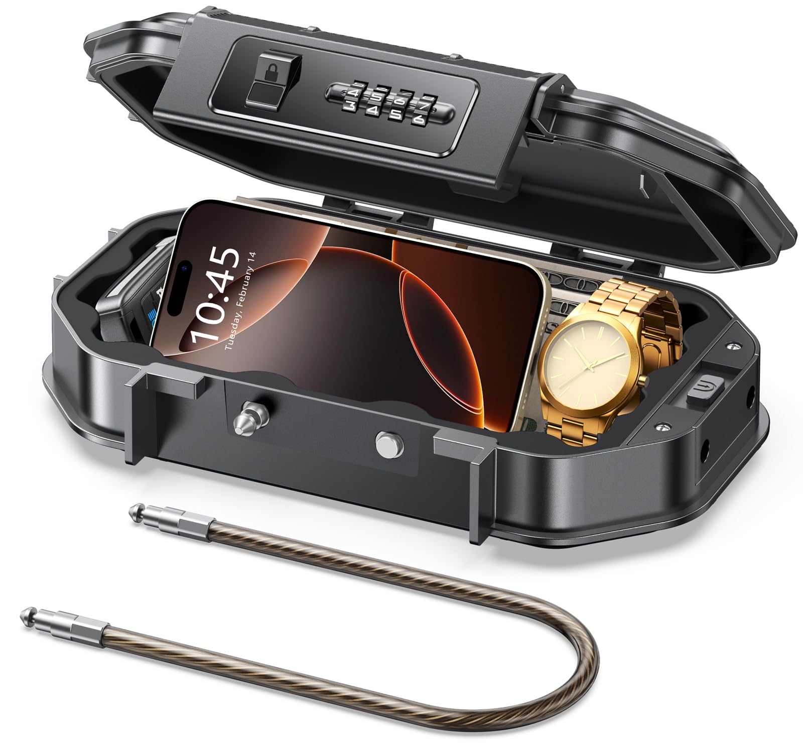 Portable Security Lock Box with Combination Lock, Waterproof Travel Safe Case with Steel Cable, Black. Box with Combination Ideal for Outdoors, Camping, Beach, dorms.