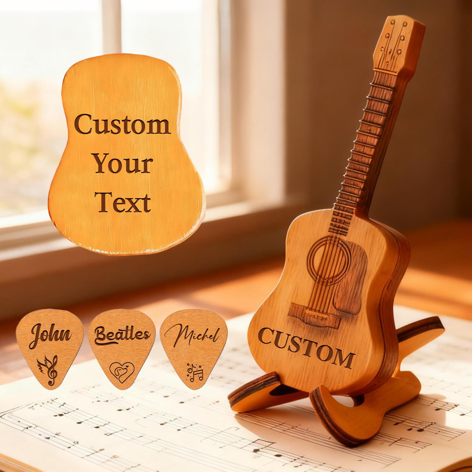 Guitar Pick Case with Name Custom Text on the Guitar-Shaped Guitar Pick Holder Picks Storage Bag Personalized Gifts for Guitar Lovers (Wood)