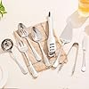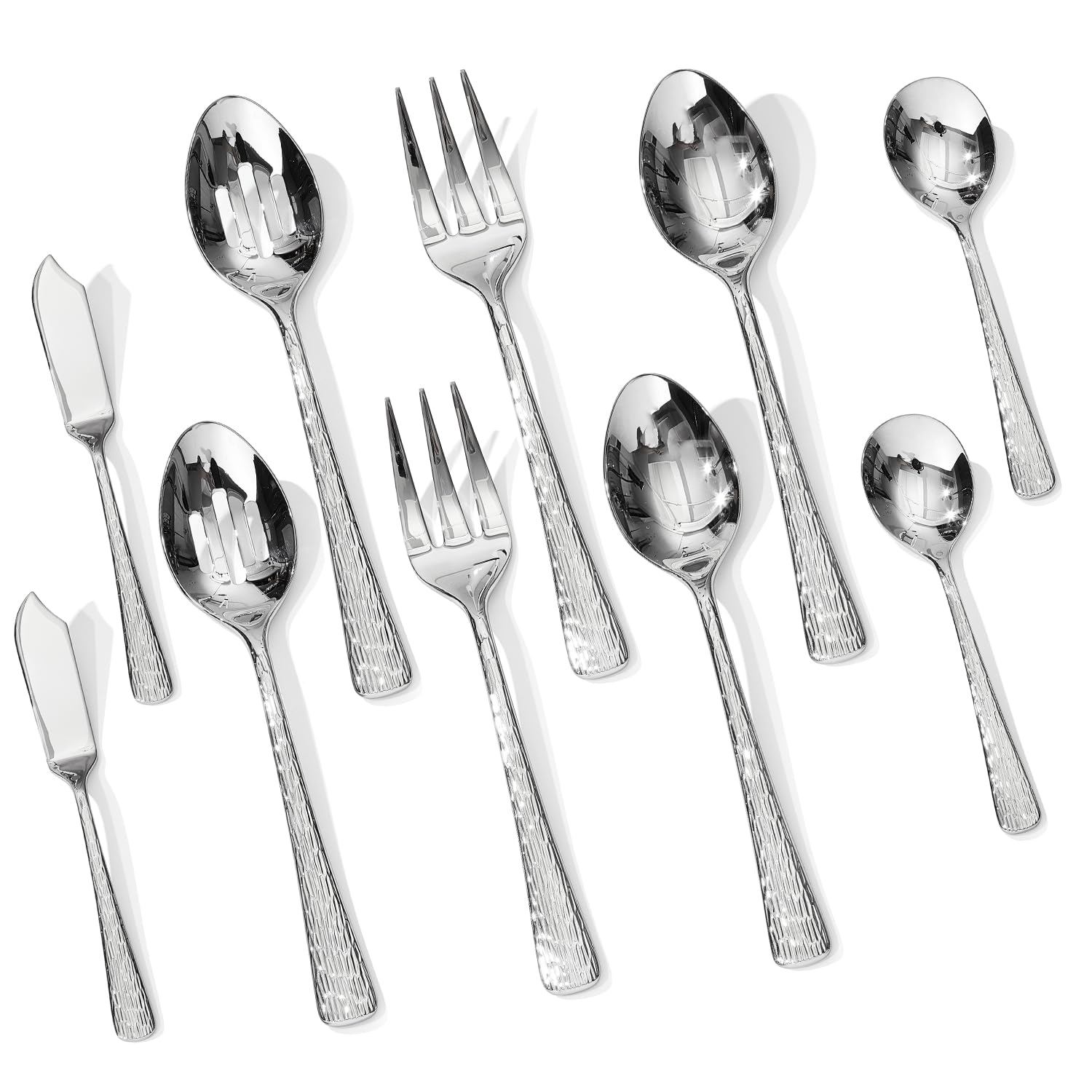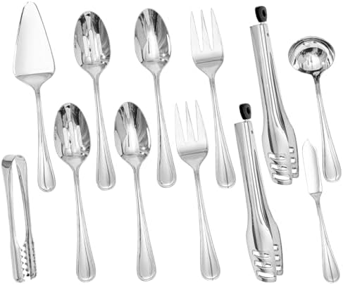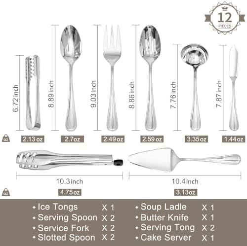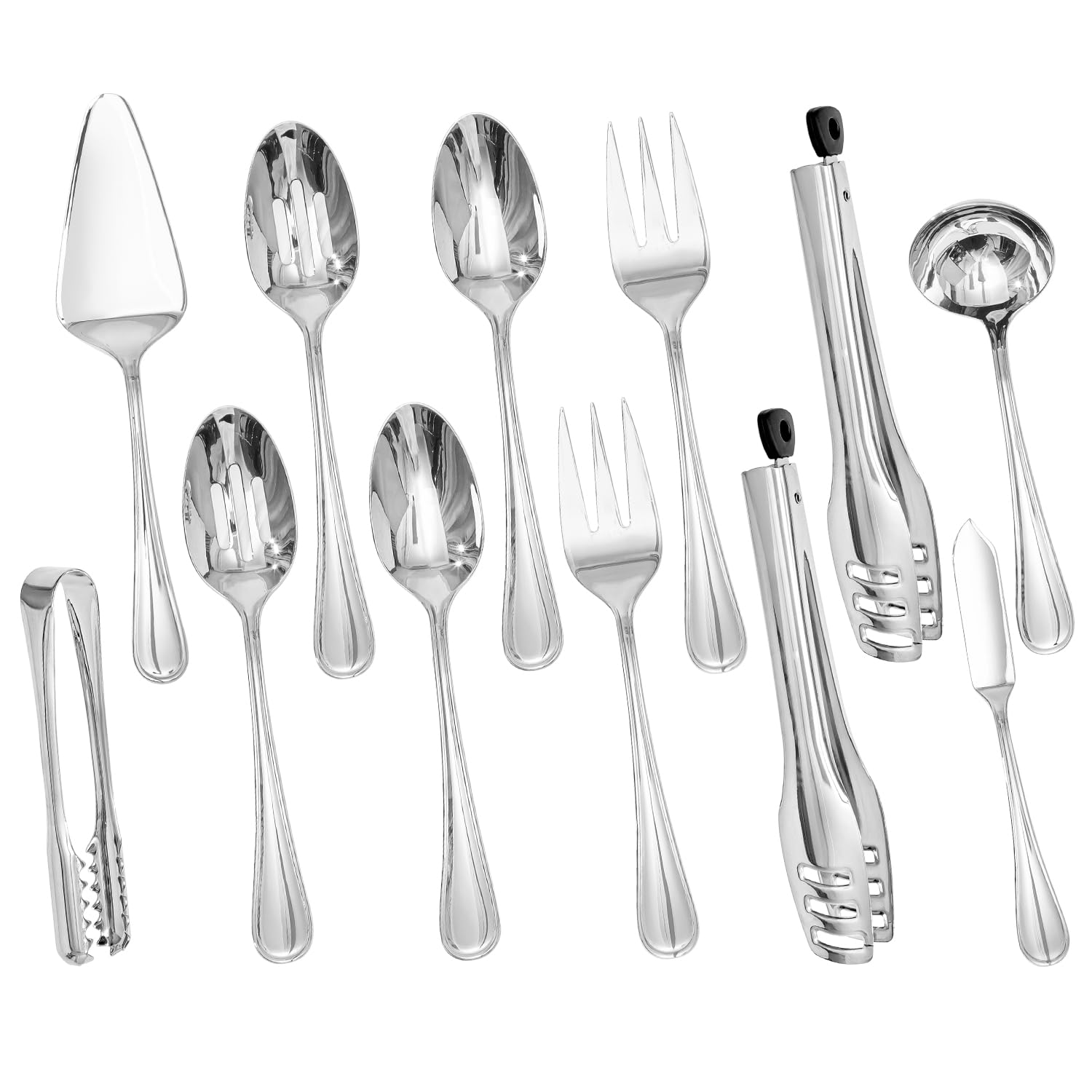 - 12 Piece Serving Utensils Including: 2 Serving Spoon, 2 Slotted Spoon, 2 Serving Tongs, 2 Serving Fork, 1 Soup Ladle, 1 Cake Server, 1 Butter Knife, 1 Ice Tongs. Each piece is sized to handle big platters and bowls, so you've always got the right tool for every dish