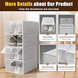 Stackable Shoe Storage: This 24-pack of clear shoe boxes with lids maximizes closet space, each 13x9.1x5.5in box fitting shoes up to US size 10 Durable PP Material: Made from sturdy PP, these clear shoe storage boxes stack securely with buckle connections, ensuring stability and long-lasting use Transparent and Breathable: Clear front doors with round holes allow easy shoe identification and ventilation, keeping your clear plastic shoe boxes odor-free Versatile Organization: Ideal for shoes, cosmetics, toys, or books, these plastic shoe bins can be placed in closets, bedrooms, or under beds for tidy storage Easy Assembly and Maintenance: Tool-free setup with included manual; smooth-edged cajas de zapatos transparentes wipe clean effortlessly for lasting clarity