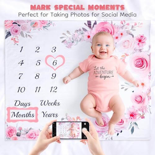 - 👶🏻💖【TRACK YOUR LOVELY BABY’S GROWTH】Don’t miss out on your baby’s monthly cute moments! With this 60" x 40" baby monthly milestone blanket girl, you can capture the most adorable baby pictures and share them with your family and friends. Perfect for monthly baby milestone blanket photos, this baby photo blanket makes it easy to track your baby’s growth in style. Moreover, this soft luxurious baby swaddle blanket creates a warm and nurturing environment for your little one.
