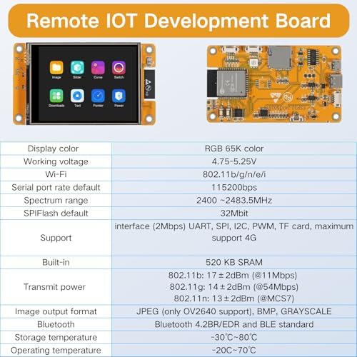 - WIDELY USE: It supports Arduino IDE, Espressif IDF, Lua RTOS, Micro Python with LVGL graphics library compatibility, widely utilized for smart home device image transmission, wireless monitoring, smart agriculture QR wireless recognition, wireless positioning system signal, and other IoT applications.