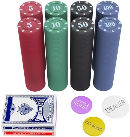 - Class Poker Chips And Cards: Everything you need for a classic game of poker night with friends or family. Includes poker chips in traditional white, blue, red,black and green, a single deck of classic poker cards and one large dealer, two blind dealers of different sizes
