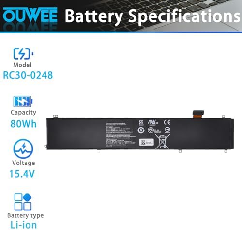 - 【Specifications】 ①RC30-0248 battery for Razer Blade Replacement Battery, ②Type: Li-ion; ③Our RC30-0248 Battery Replacement for Razer 80wh Standard RC30-0248 Rechargeable li-ion battery.④Voltage: 11.4V; ⑤Capacity: 80Wh 5209mAh; ⑥Color: Black;⑦Condition: New;