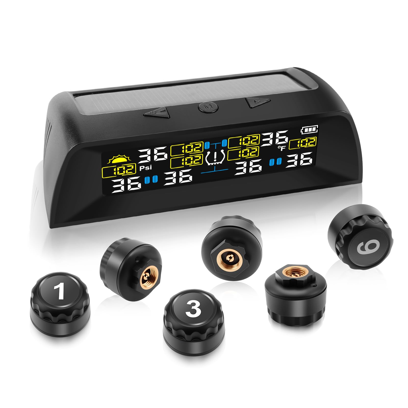- Auto&Wireless Solar Charging:The TPMS tire pressure monitor system has the function of wireless solar charging and can be used as an auxiliary charging method to ensure that users can use this monitor for a long time. Besides, it has extremely strong flexibility. Users can place the monitor on the Windowshield or the center console. When there is sunlight, the TPMS will automatically charge.This ensures that you can focus on driving without worrying about the battery level