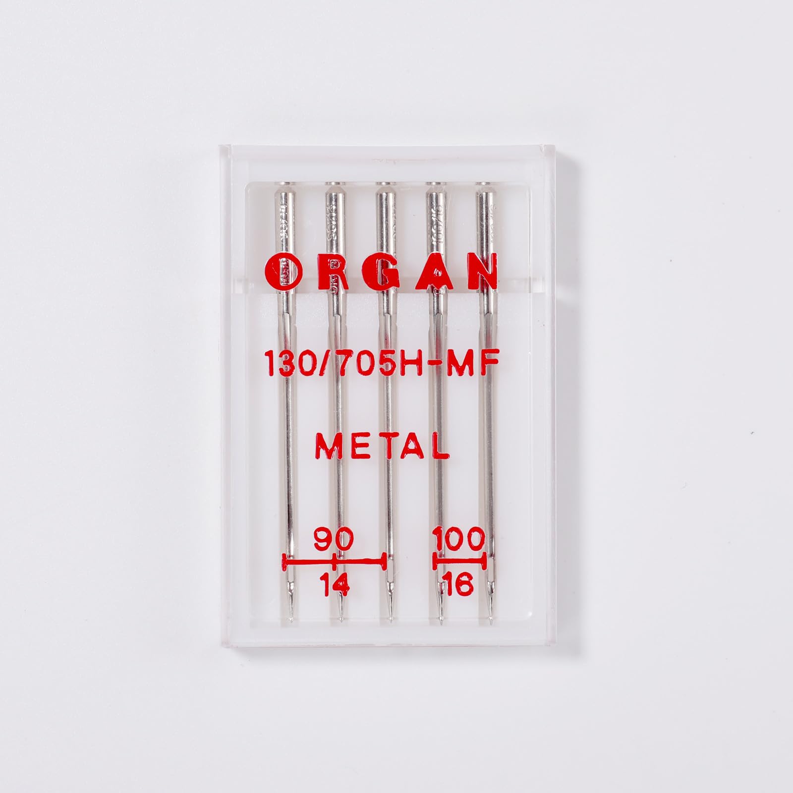Organ Metallic Sewing Machine Needles 5-Pack, Assorted Sizes 90/14 (3pcs) & 100/16 (2pcs), Large Eye & Smooth Groove for Metallic Thread, Embroidery Compatible with Home Sewing Machines